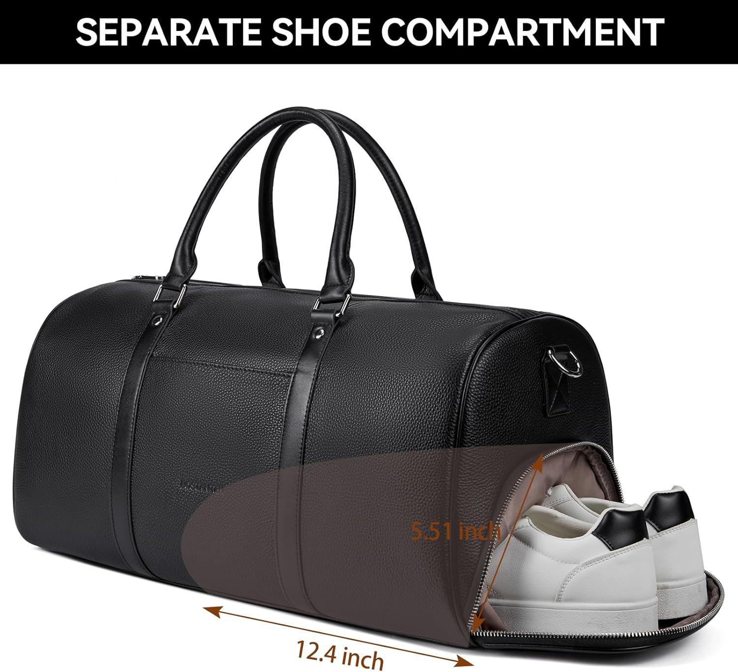 STRUCTURE: The oversized duffel bag contains 1 big inner compartment, 1 inner zipper pocket, 2 insert pockets. There is a handy shoe compartment with zipper closure. This weekend bag easily hold your 15 inch Laptop, iPad, iPhone, clothes , shoes and other Things. The weekend bag is ideal for plane or train travel. The removable shoulder strap is adjustable and padded for comfort.