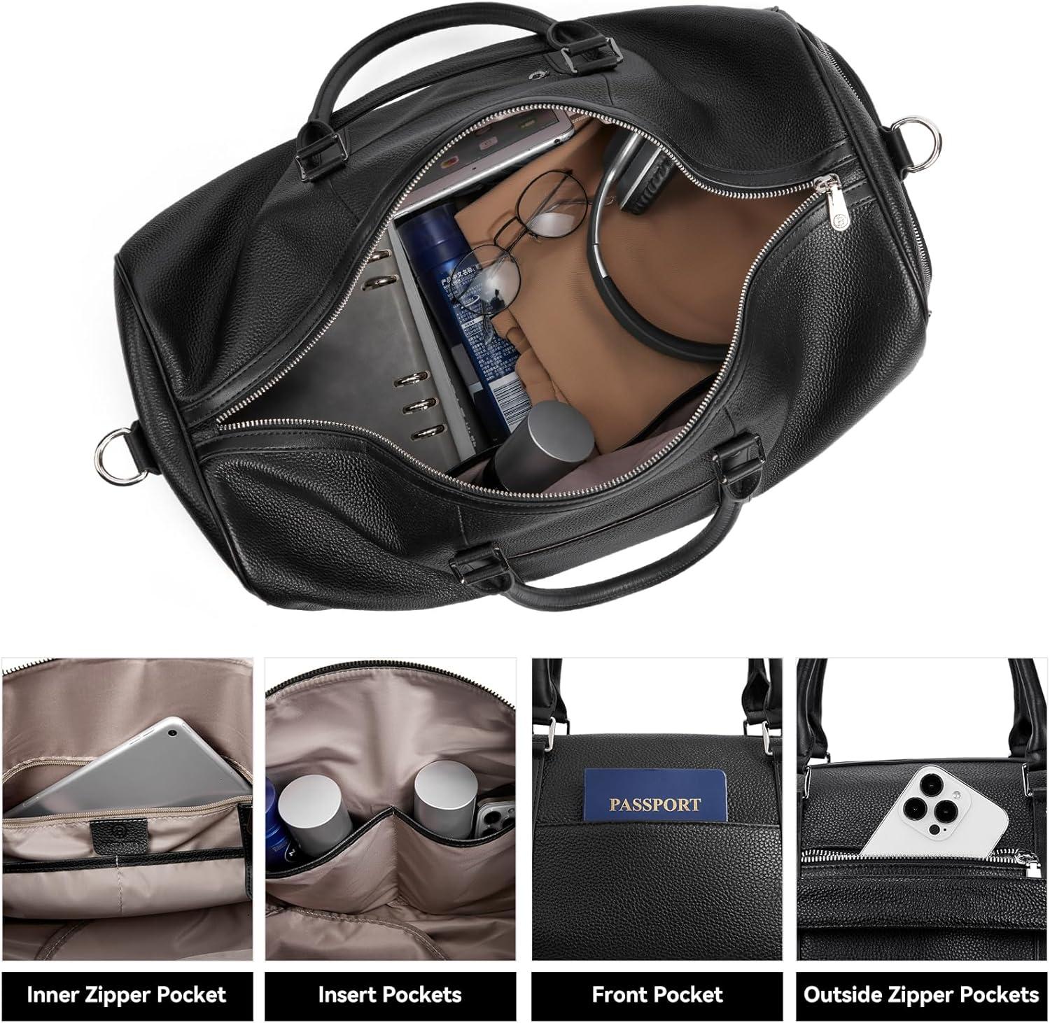 STRUCTURE: The oversized duffel bag contains 1 big inner compartment, 1 inner zipper pocket, 2 insert pockets. There is a handy shoe compartment with zipper closure. This weekend bag easily hold your 15 inch Laptop, iPad, iPhone, clothes , shoes and other Things. The weekend bag is ideal for plane or train travel. The removable shoulder strap is adjustable and padded for comfort.