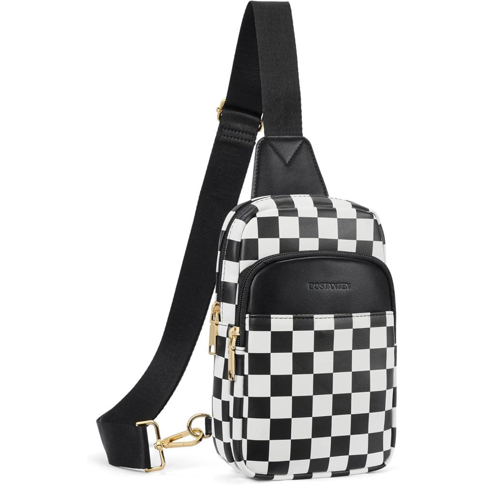 BOSTANTEN Sling Bag Quilted Crossbody Bags for Women Cross Body Purse Leather Fanny Pack with Adjustable Guitar Strap(A-checkered Black)