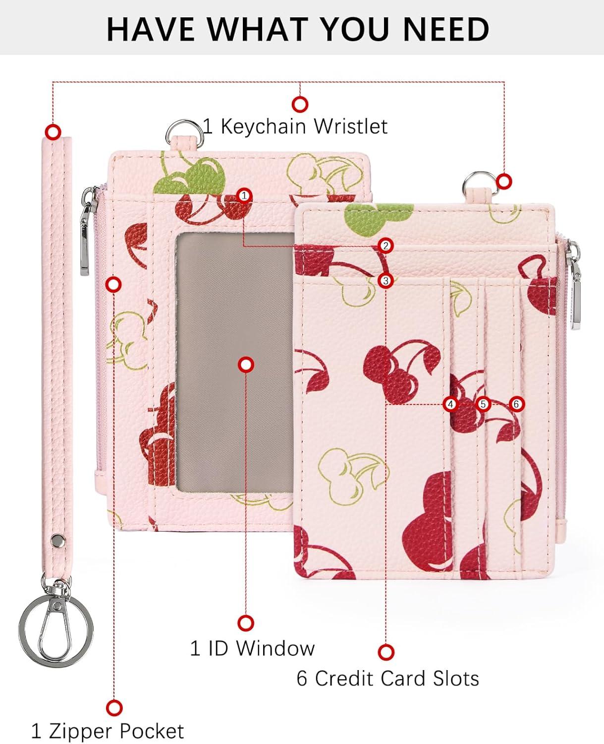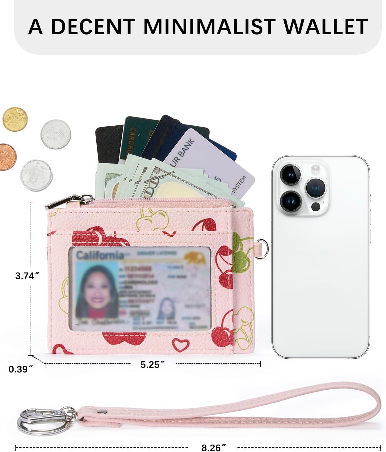 Cute But Roomy: This small wallet is slim enough to fit nicely in smaller purses or to carry in a pocket. Lite weight and enough space for cards and ID. Other than that, a nice little zipped section for cash, some loose coins, or whatever. (6 card slots, 1 id window, 1 zipper pocket)