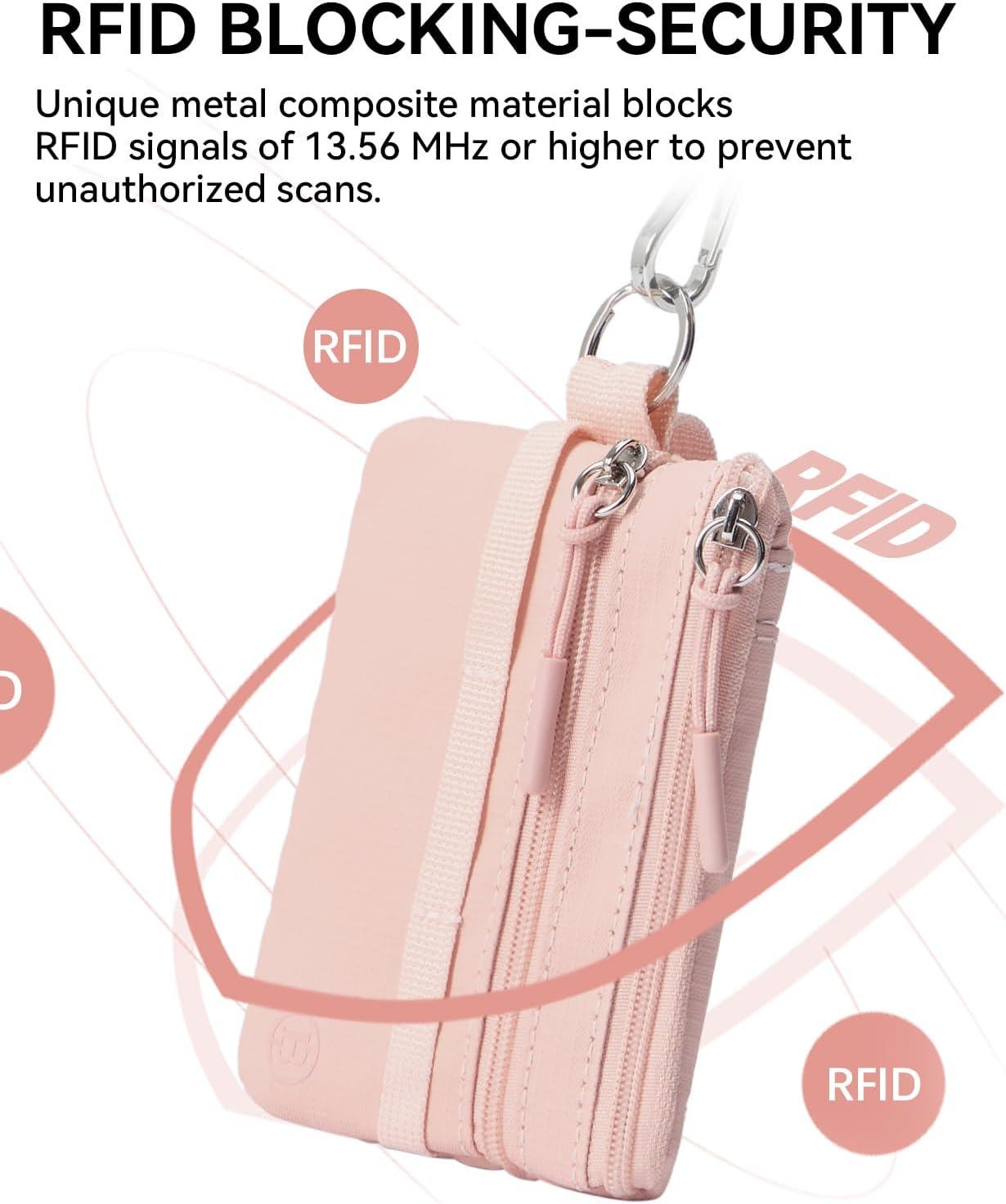 Pocket-Sized and Spacious: Small wallet size 4.13'' x 3.5'' x 0.39'', long lanyard size 20.07'' x 0.47''. With 3 zippered compartments, 1 separate ID window and 1 separate card slot are suitable for sorting and holding cash and cards, some coins, keys as well. The lanyard is long enough to be easily pulled out and used. You can also pin the RFID wallet to the bag, which helps stop pickpockets and ensures that the items are safely placed back into the travel wallet.