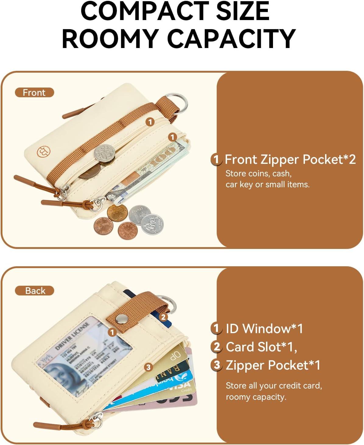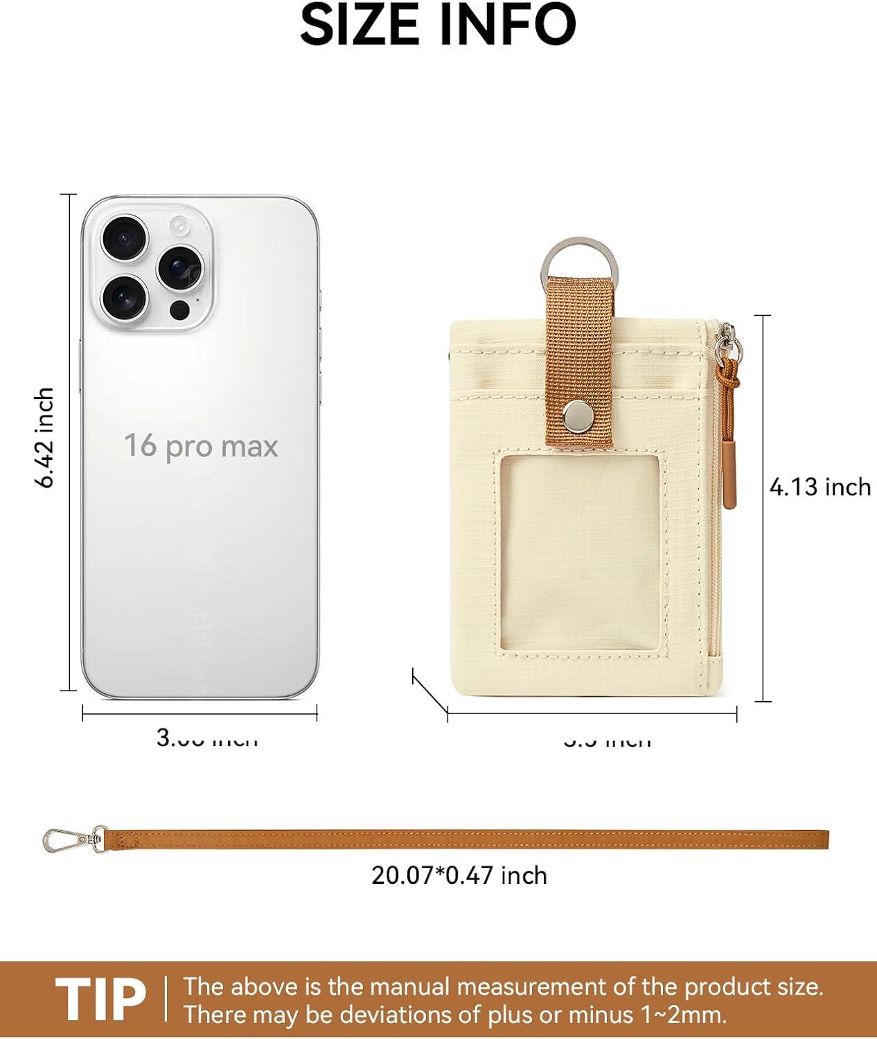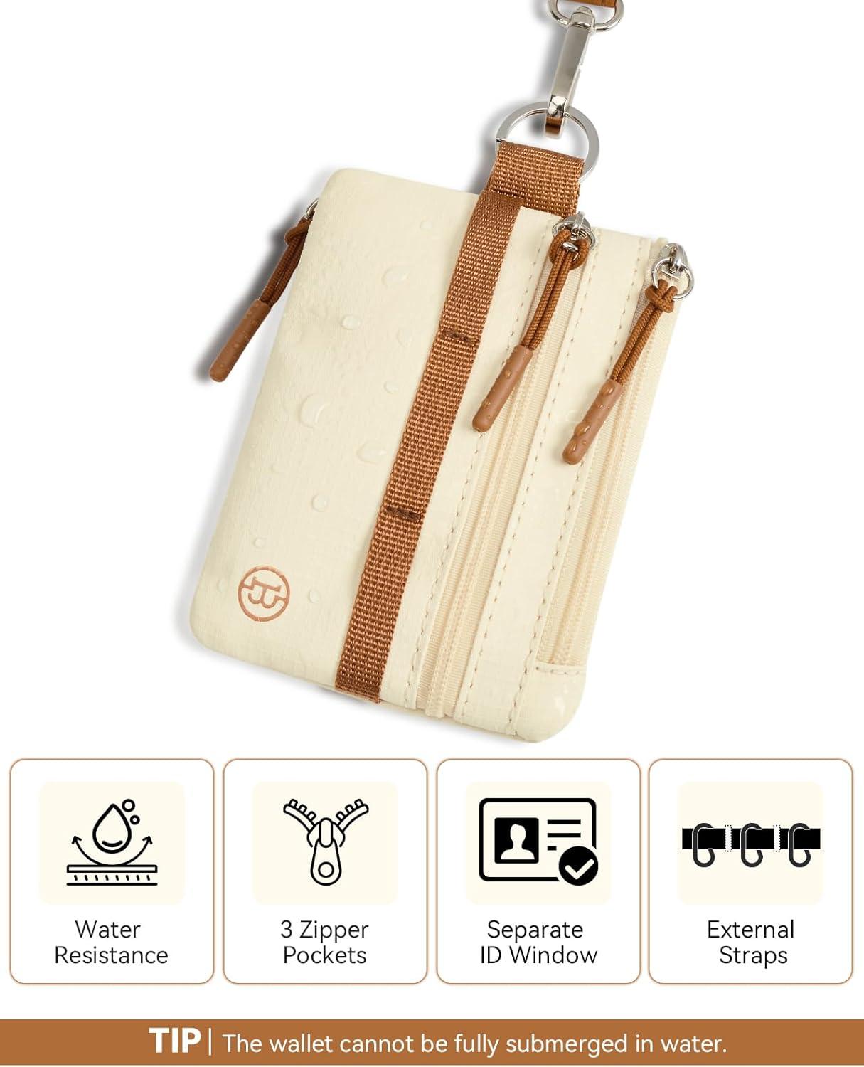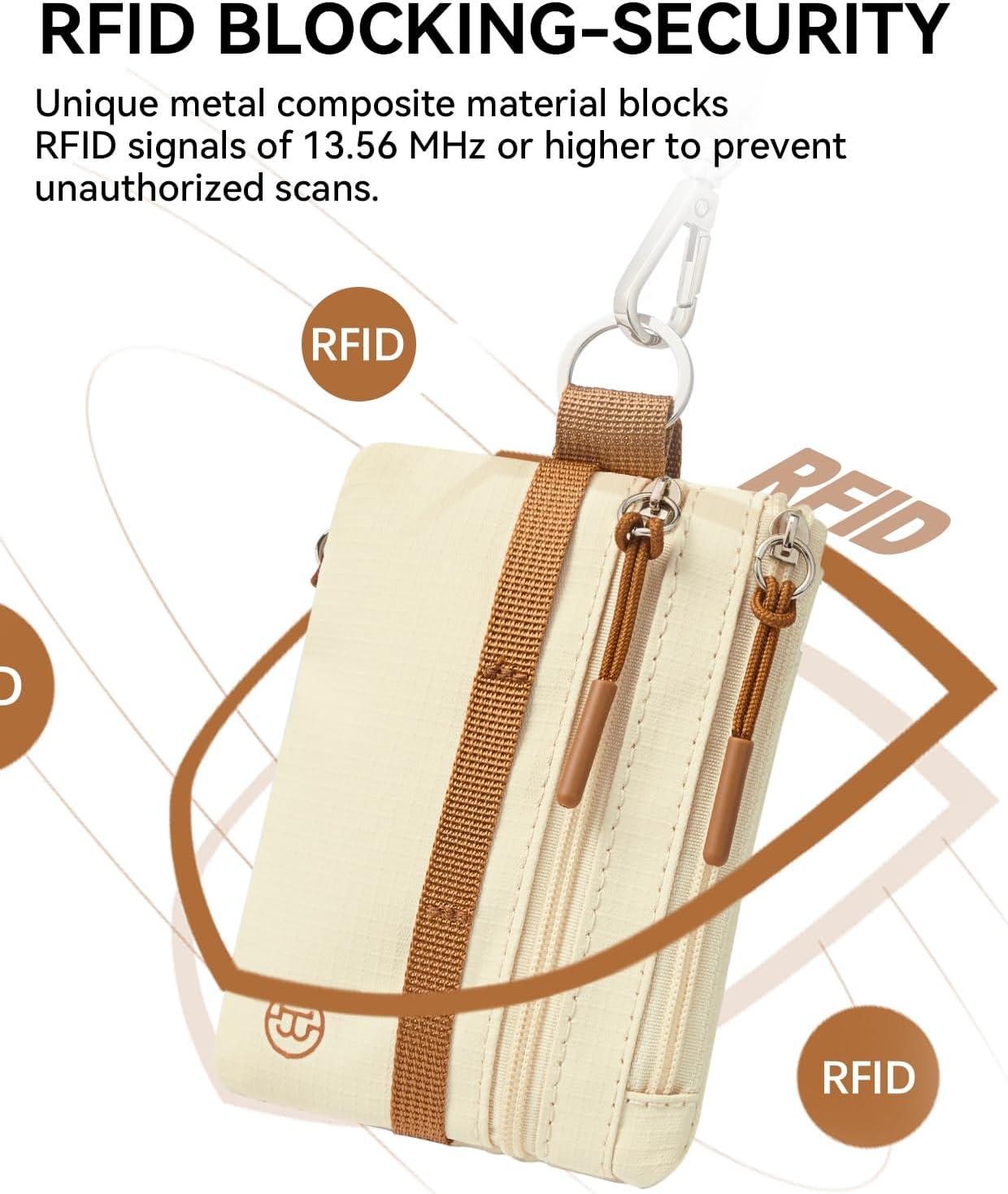 Pocket-Sized and Spacious: Small wallet size 4.13'' x 3.5'' x 0.39'', long lanyard size 20.07'' x 0.47''. With 3 zippered compartments, 1 separate ID window and 1 separate card slot are suitable for sorting and holding cash and cards, some coins, keys as well. The lanyard is long enough to be easily pulled out and used. You can also pin the RFID wallet to the bag, which helps stop pickpockets and ensures that the items are safely placed back into the travel wallet