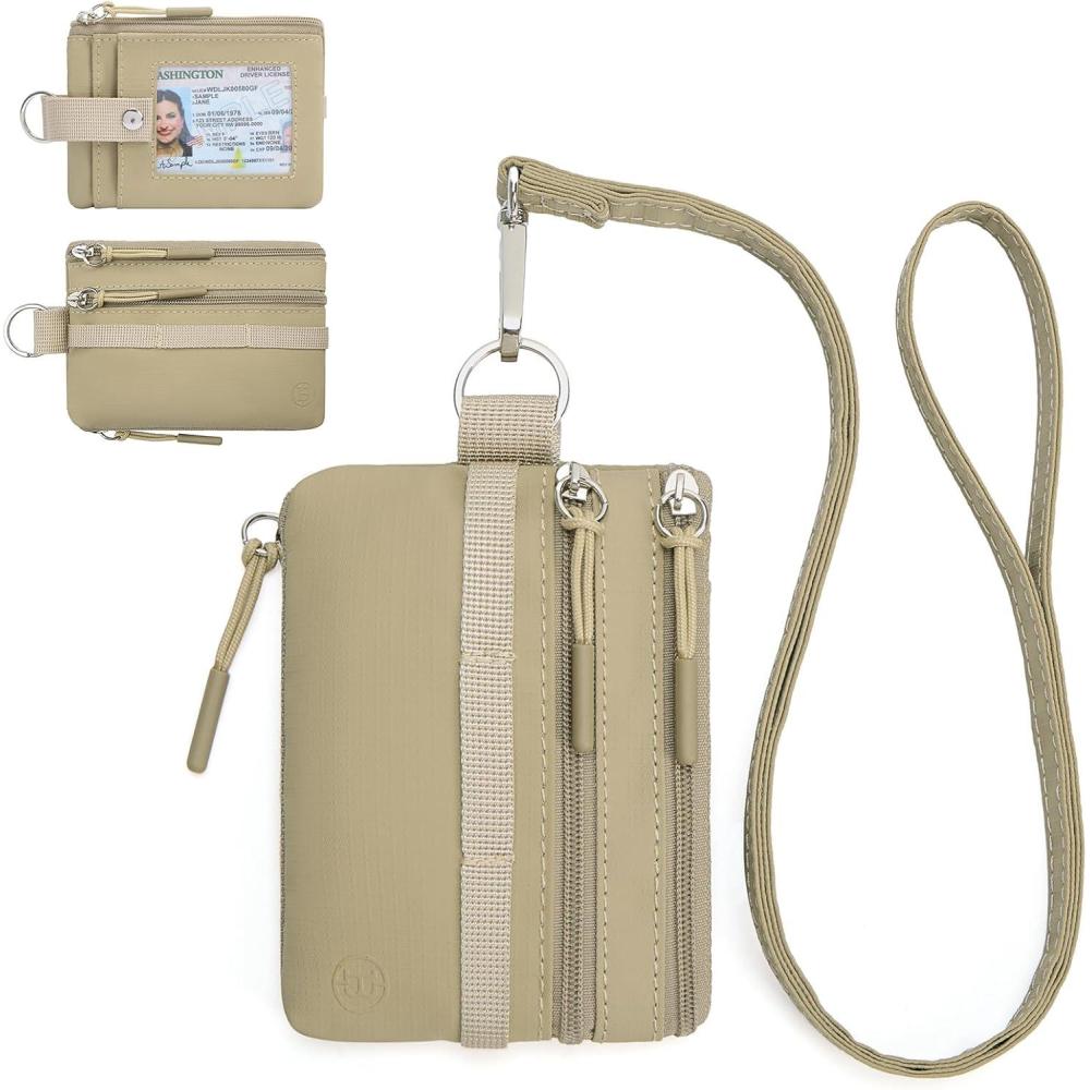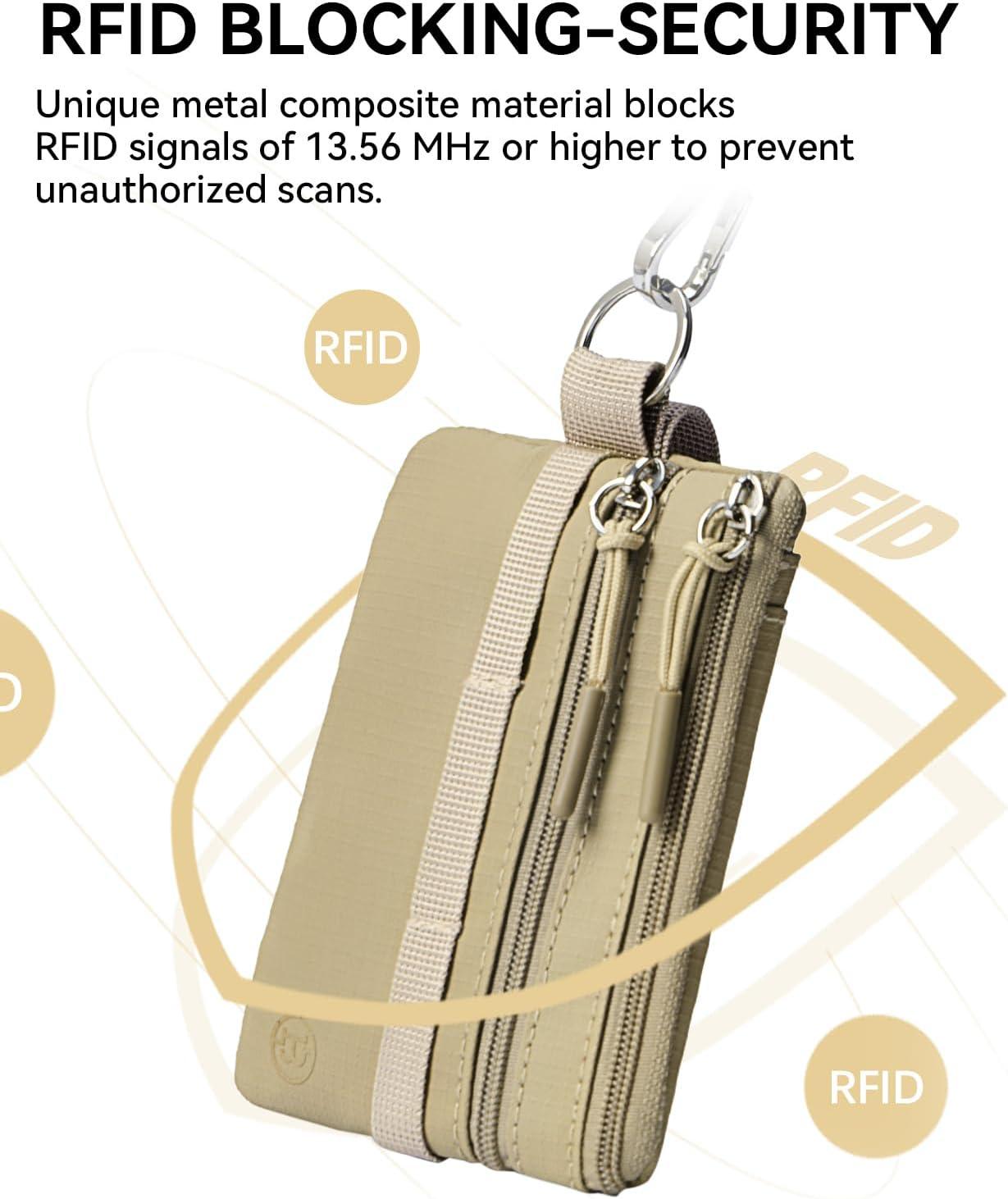 Pocket-Sized and Spacious: Small wallet size 4.13'' x 3.5'' x 0.39'', long lanyard size 20.07'' x 0.47''. With 3 zippered compartments, 1 separate ID window and 1 separate card slot are suitable for sorting and holding cash and cards, some coins, keys as well. The lanyard is long enough to be easily pulled out and used. You can also pin the RFID wallet to the bag, which helps stop pickpockets and ensures that the items are safely placed back into the travel wallet
