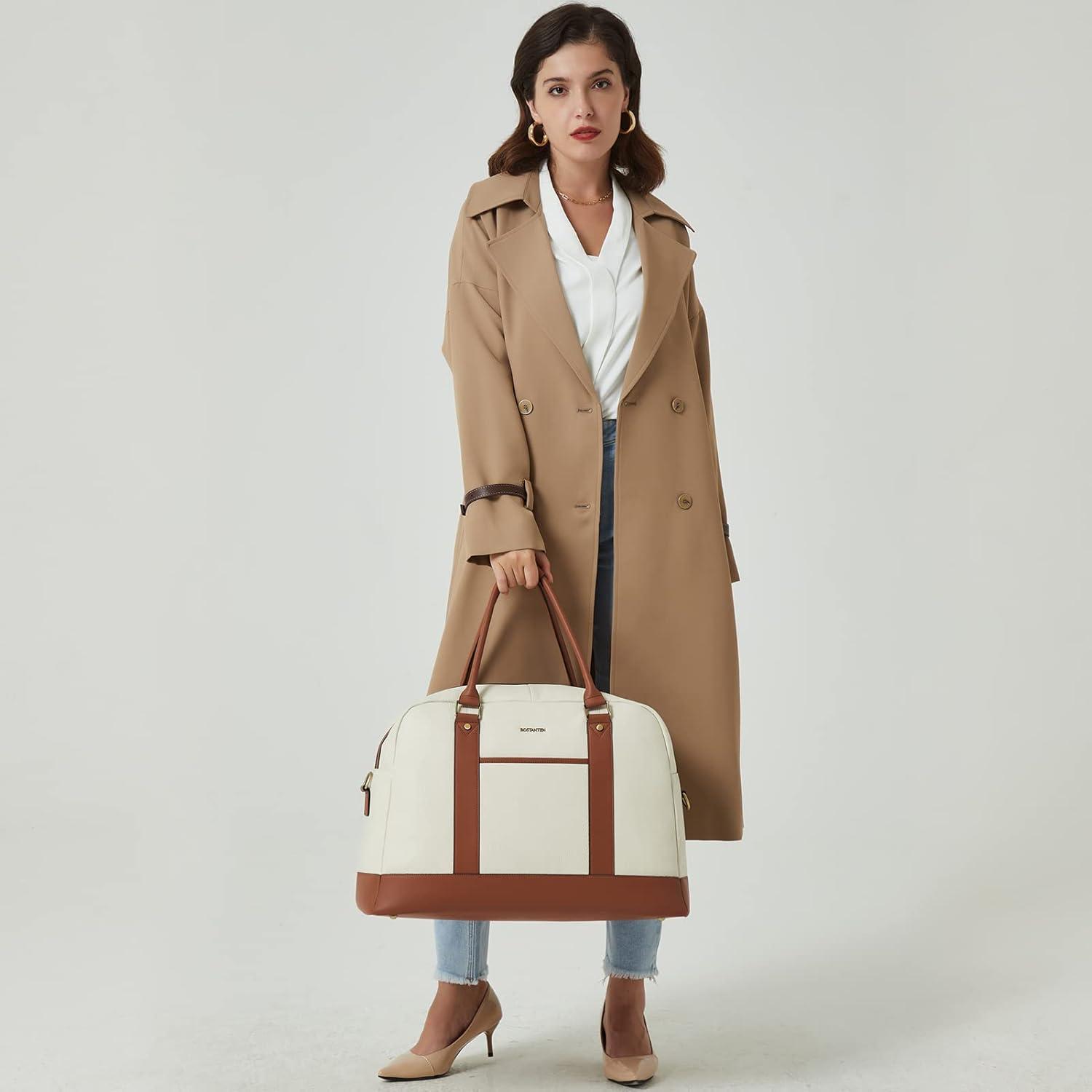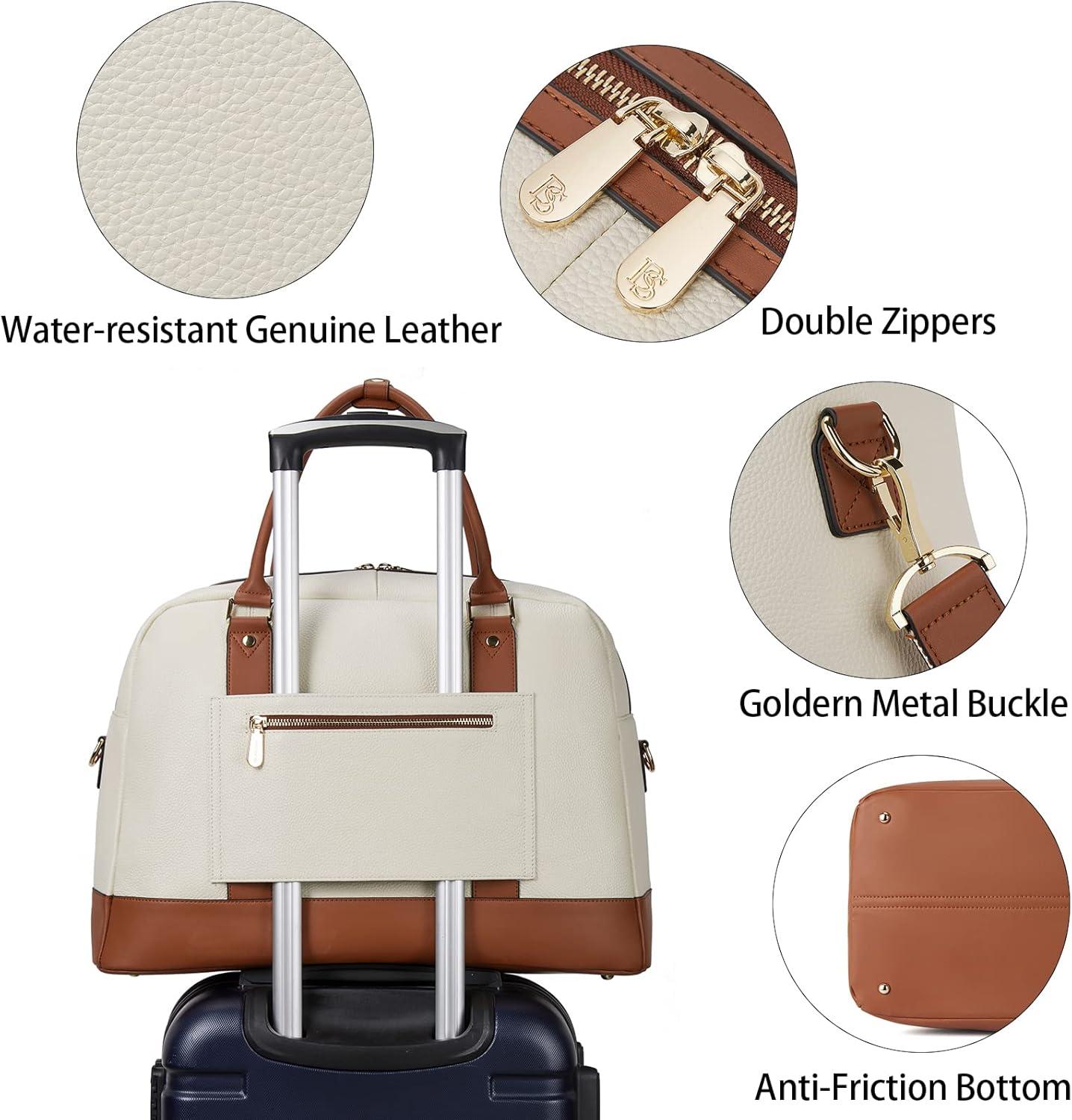 BOSTANTEN Weekender Bags for Women Leather Travel Duffle Bag Carry On Large Tote Duffel with Shoe Compartment and Trolley Sleeve(A-Beige&Brown)