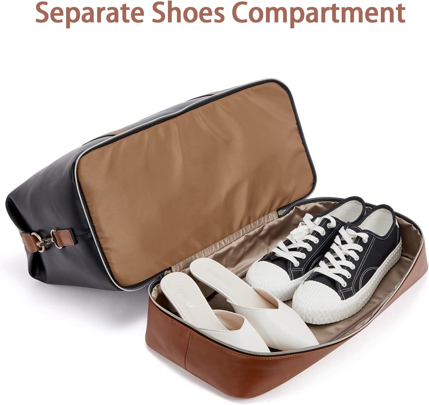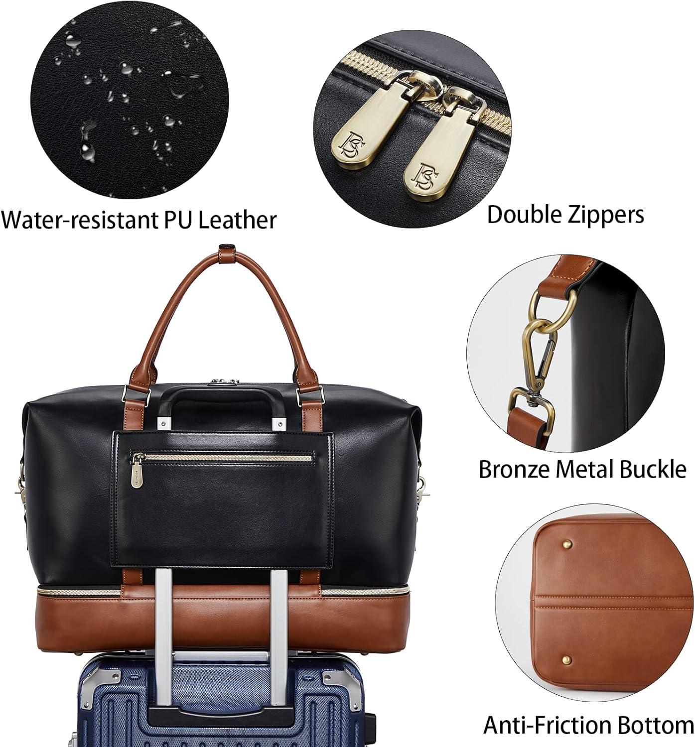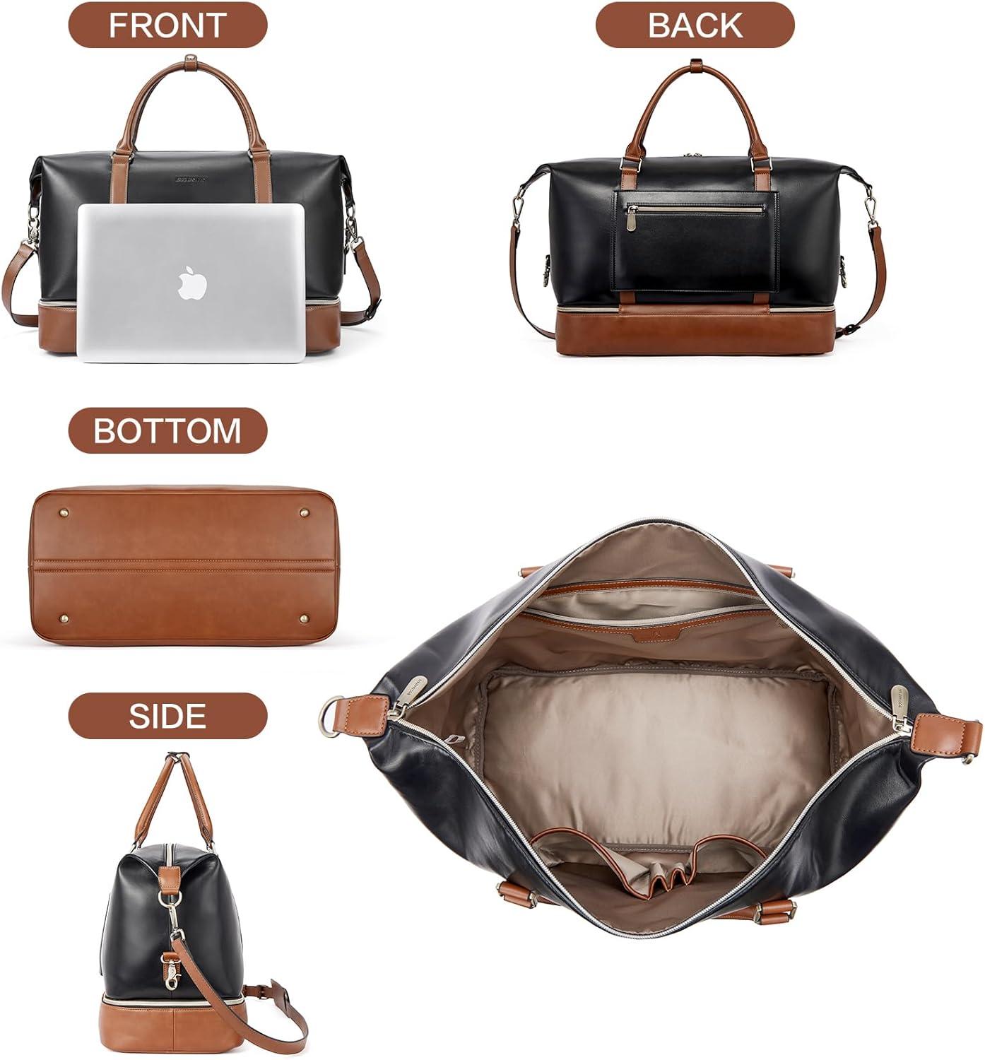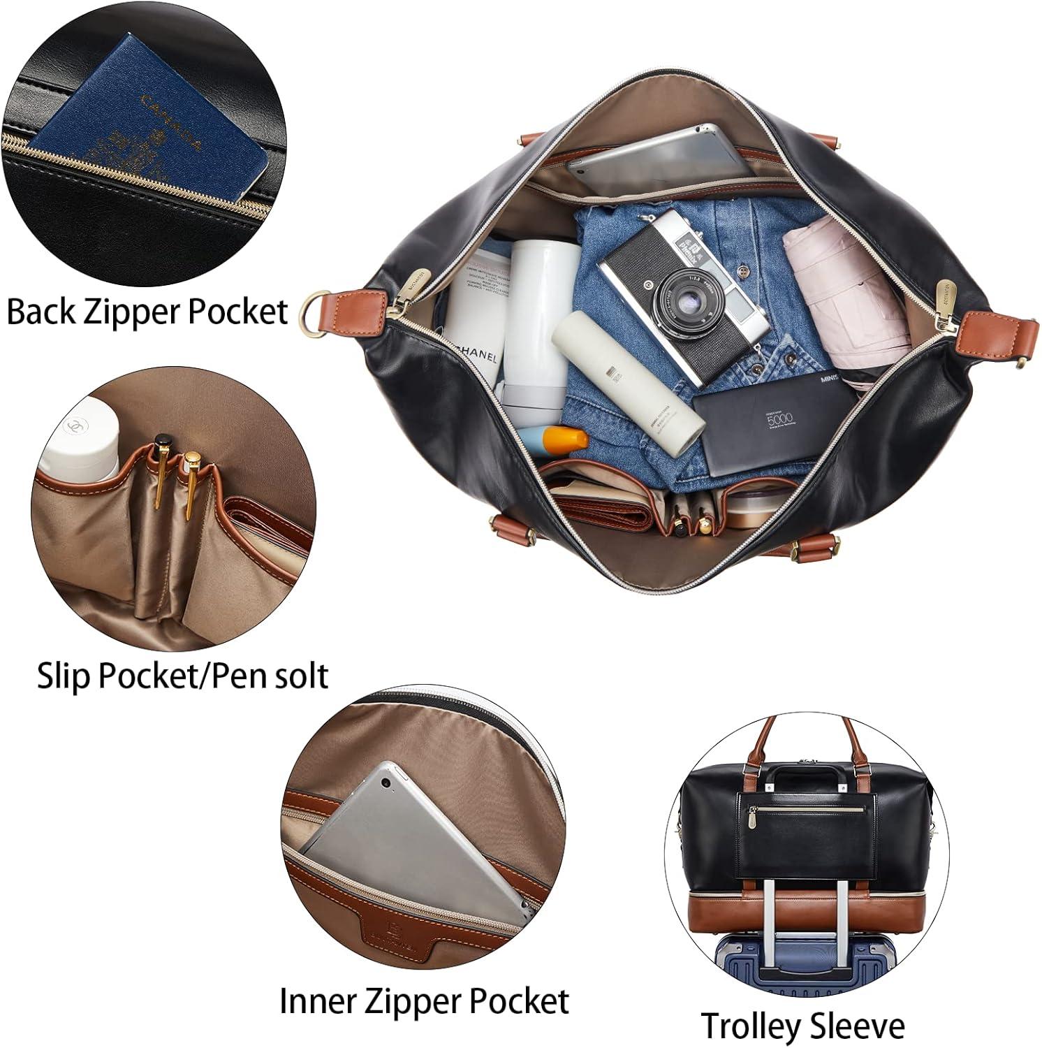 Premium Material — This weekender bag for women is handmade by professional craftsman with high quality water-resistant pu leather, soft khaki fabric lining,and vintage bronze hardware.Well-knit stitch make it bear heavier weight stuff without tearing.Stylish but also durable as long as the time you use it